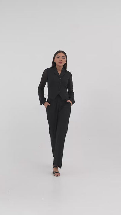 This co-ord set includes a tailored waistcoat-style top with a coat collar and structured darts, paired with matching straight-fit trousers. The waistcoat is crafted in a poly-viscose-lycra blend for structure and comfort, while sheer georgette sleeves introduce movement and delicacy.