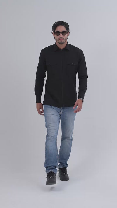 This black shirt is designed with a zip-front closure, structured collar, and dual flap chest pockets, giving it a relaxed yet authoritative presence. The tailored cut ensures a clean silhouette, making it versatile enough to pair with denim or tailored trousers.
