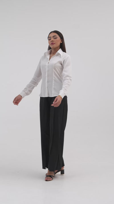 This white shirt is crafted in a slim fit with precision darting and contoured seams that highlight the feminine form while offering ease of movement. The structured spread collar frames the neckline beautifully, making it versatile for both office wear and evening refinement.