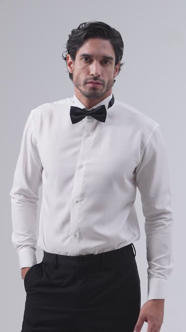 This white shirt is cut in a tailored fit with a clean plain front and a collar designed to hold a bow tie with balance and precision. The minimal design allows the bow tie to take focus, while the shirt maintains a sharp silhouette.